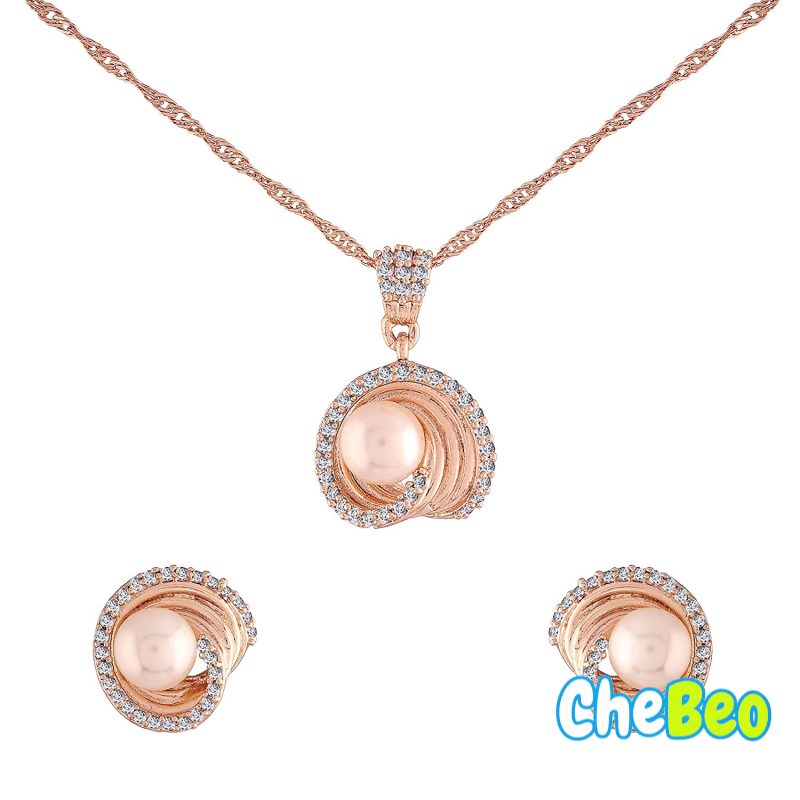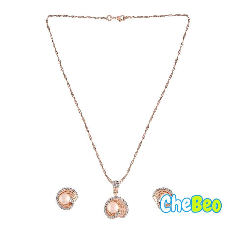 18k Rose Gold Plated Glittering Cubic Zirconia Designer Chain Pendent Necklace Jewellery Set
