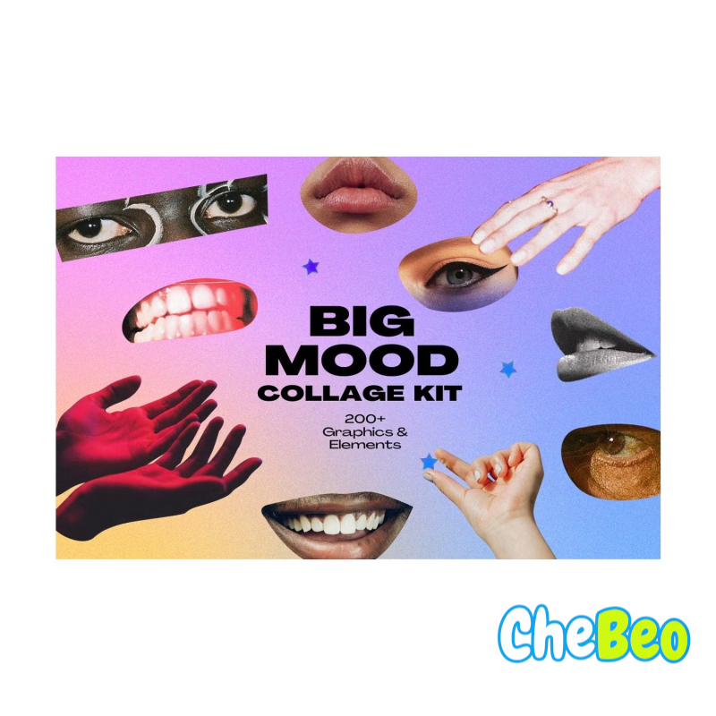 Big Mood collage kit features more than 200 cut-outs of Hands, Eyes, and Mouth. These can be used to add bold extra flavor to a variety of designs, art, and merchandise. Also includes custom hand-made collage elements like paint brush strokes and colorful paper scraps.