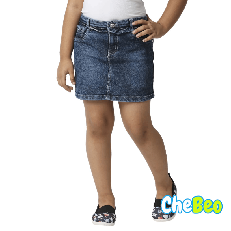 Girls Blue Solid Straight Mini Denim Skirt