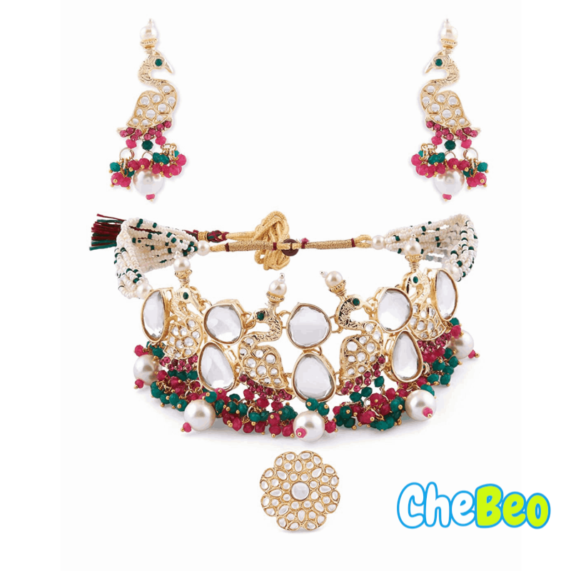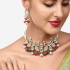 Rani Pink & Green Cluster Beads Kundan Peacock Inspired Necklace